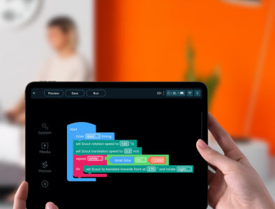 Scout also supports Scratch Language for programing additional functionality and for learning simple programming skills for STEM education. Advanced developers can execute C/C++ programs on Scout. More extension tools can be designed as add-on skills to the robot. Much more can be done on this platform.